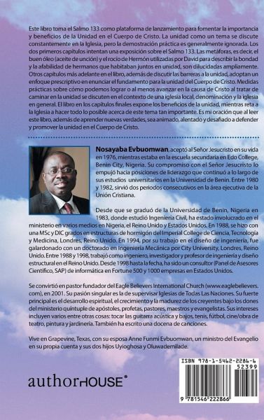 Este libro toma el Salmo 133 como plataforma de lanzamiento para fomentar la importancia y beneficios de la Unidad en el Cuerpo de Cristo. La unidad como un tema se discute constantemente en la Iglesia, pero la demostración práctica es generalmente ignorada. Los dos primeros capítulos intentan una exposición sobre el Salmo 133. Las metáforas, es decir, el buen óleo (aceite de unción) y el rocío de Hermón utilizadas por David para describir la bondad y la afabilidad de hermanos que habitaban juntos en unidad, son dilucidadas ampliamente. Otros capítulos más adelante en el libro, además de discutir las barreras a la unidad, adoptan un enfoque prescriptivo en enunciar el fundamento para la unidad del Cuerpo de Cristo. Medidas prácticas sobre cómo podemos lograr o al menos avanzar en la causa de Cristo al tratar de caminar en la unidad se discuten en el contexto de una iglesia local, denominación y la iglesia en general. El libro en los capítulos finales expone los beneficios de la unidad, mientras reta a la Iglesia a hacer todo lo posible acerca de este tema tan importante. Es mi oración que al leer este libro, además de aprender nuevas verdades, sea animado, alentado y desafiado a defender y promover la unidad en el Cuerpo de Cristo.