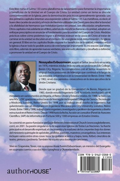 Este libro toma el Salmo 133 como plataforma de lanzamiento para fomentar la importancia y beneficios de la Unidad en el Cuerpo de Cristo. La unidad como un tema se discute constantemente en la Iglesia, pero la demostración práctica es generalmente ignorada. Los dos primeros capítulos intentan una exposición sobre el Salmo 133. Las metáforas, es decir, el buen óleo (aceite de unción) y el rocío de Hermón utilizadas por David para describir la bondad y la afabilidad de hermanos que habitaban juntos en unidad, son dilucidadas ampliamente. Otros capítulos más adelante en el libro, además de discutir las barreras a la unidad, adoptan un enfoque prescriptivo en enunciar el fundamento para la unidad del Cuerpo de Cristo. Medidas prácticas sobre cómo podemos lograr o al menos avanzar en la causa de Cristo al tratar de caminar en la unidad se discuten en el contexto de una iglesia local, denominación y la iglesia en general. El libro en los capítulos finales expone los beneficios de la unidad, mientras reta a la Iglesia a hacer todo lo posible acerca de este tema tan importante. Es mi oración que al leer este libro, además de aprender nuevas verdades, sea animado, alentado y desafiado a defender y promover la unidad en el Cuerpo de Cristo.