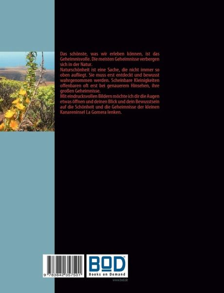 Das schönste, was wir erleben können, ist das Geheimnisvolle. Die meisten Geheimnisse verbergen sich in der Natur.Naturschönheit ist eine Sache, die nicht immer so oben aufliegt. Sie muss erst entdeckt und bewusst wahrgenommen werden. Scheinbare Kleinigkeiten offenbaren oft erst bei genauerem Hinsehen, ihre großen Geheimnisse. Mit eindrucksvollen Bildern möchte der Autor die Augen etwas öffnen und den Blick und das Bewusstsein auf die Schönheit und die Geheimnisse der kleinen Kanareninsel La Gomera lenken. Lassen Sie sich inspirieren, versetzen Sie sich in die traumhaften Landschaften mit seinen gigantischen Gebirgszügen und märchenhaften Wäldern hinein und erleben Sie das herrliche Panorama von La Gomera.