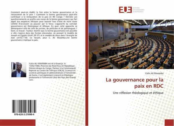 Comment peut-on établir le lien entre la bonne gouvernance et la restauration de la paix ? Comment la bonne gouvernance peut-elle contribuer à la restauration de la paix en RD Congo ? Derrière ces questionnements se profile une vision de la bonne gouvernance qui fait appel aux exigences éthiques pour booster hors d'état de nuire toute velléité d'accession au pouvoir par la force. L'approche du concept gouvernance est théologique et éthique. En quoi cette approche se démarquera-t-elle de celle de juristes, de politistes et de politologues ? Dans ce travail, l'auteur montre que la bonne gouvernance est possible si elle s'exerce dans des formes diaconales, en prenant le modèle de Joseph en Égypte (Gn41,38-57) et le modèle de Jésus dans l'évangile de Jean (Jn10,1-18). Ce faisant, pour C. Ali Mwamba une bonne gouvernance implique la paix.