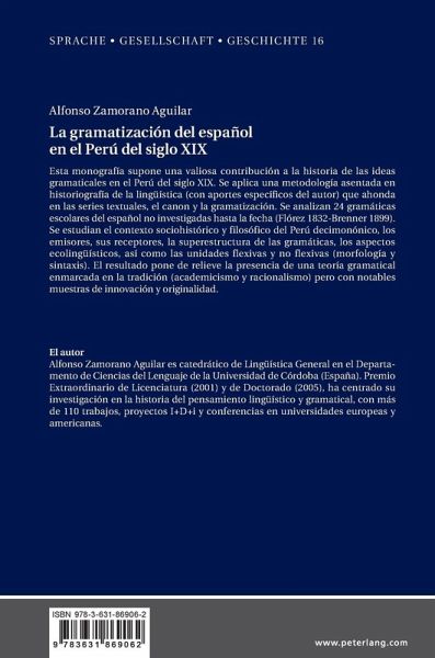 Esta monografía supone una valiosa contribución a la historia de las ideas gramaticales en el Perú del siglo XIX. Se aplica una metodología asentada en historiografía de la lingüística (con aportes específicos del autor) que ahonda en las series textuales, el canon y la gramatización. Se analizan 24 gramáticas escolares del español no investigadas hasta la fecha (Flórez 1832-Brenner 1899). Se estudian el contexto sociohistórico y filosófico del Perú decimonónico, los emisores, sus receptores, la superestructura de las gramáticas, los aspectos ecolingüísticos, así como las unidades flexivas y no flexivas (morfología y sintaxis). El resultado pone de relieve la presencia de una teoría gramatical enmarcada en la tradición (academicismo y racionalismo) pero con notables muestras de innovación y originalidad.