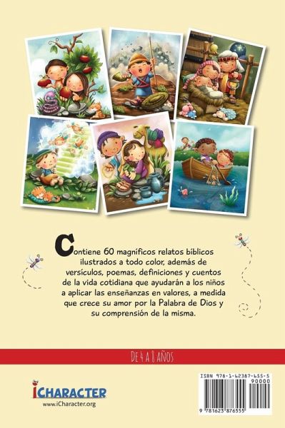 Contiene 60 encantadores relatos bíblicos ilustrados que ayudarán a los niños a aplicar valiosas enseñanzas a su vida cotidiana, a la par que aumenta su amor por la Palabra de Dios y su comprensión de la misma. Sean cuales sean los objetivos que persigues al criar a tus hijos, estos tendrán mayores posibilidades de convertirse en personas felices y exitosas si les inculcas valores morales objetivos por medio de la Palabra de Dios. Estos sencillos relatos de la Biblia presentan una oportunidad especial de fomentar valores bíblicos en la vida de tus hijos. "Toda la Escritura es inspirada por Dios y es útil para enseñarnos lo que es verdad y para hacernos ver lo que está mal en nuestra vida. Nos corrige cuando estamos equivocados y nos enseña a hacer lo correcto." (2 Timoteo 3 16) Nota a los padres y tutores: Estos relatos bíblicos tienen por objeto ayudar a los niños a identificar importantes rasgos morales. Debido a que hemos procurado abordar toda una serie de valores, notarán que cada relato se enfoca en un tema a la vez. Al conversar con sus hijos, los invitamos a indagar más a fondo para extraer las enseñanzas contenidas en estas historias de la Biblia según sea apropiado para su edad. Edad sugerida: hasta 8 años. Si deseas más de nuestros productos visítanos en www.icharacter.org
