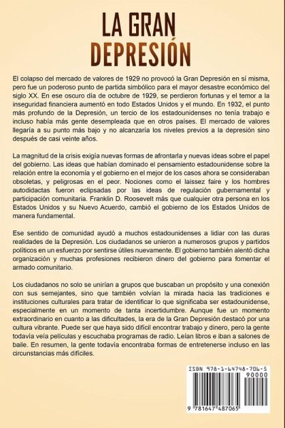 ¿Sabía que la tasa de desempleo entre 1933 y 1934 fue una de cada cuatro personas? El colapso del mercado de valores de 1929 no provocó la Gran Depresión en sí misma, pero fue un poderoso punto de partida simbólico para el mayor desastre económico del siglo XX. En ese oscuro día de octubre de 1929, se perdieron fortunas y el temor a la inseguridad financiera aumentó en todo Estados Unidos y el mundo. En 1932, el punto más bajo de la Depresión, un tercio de los estadounidenses no tenían trabajo e incluso había más gente desempleada que en otros países. El mercado de valores alcanzaría su punto más bajo y no llegaría a los niveles previos a la depresión sino después de casi veinte años. La magnitud de la crisis exigía nuevas formas de afrontarla y nuevas ideas sobre el papel del gobierno. Las ideas que habían dominado el pensamiento estadounidense sobre la relación entre la economía y el gobierno en el mejor de los casos ahora se consideraban obsoletas, peligrosas en el peor. Este fascinante libro de historia tiene como objetivo brindarle una mejor comprensión de un período que tiene muchas historias trágicas, pero que constituyen valiosas lecciones. En La Gran Depresión: una guía fascinante de la depresión económica mundial que comenzó en los Estados Unidos, incluido el desplome de Wall Street, el nuevo acuerdo de FDR, el ascenso de Hitler y más, descubrirá temas como:Causas de la Gran Depresión 1918-1929 Herbert Hoover y los Primeros Años de la Depresión Las elecciones de 1932 Los 100 Días y el Primer Mandato de FDR, 1933-1937 Segundo Mandato de FDR: Desafíos y Críticas La Cultura de la Depresión El Deporte y la Gran Depresión La Celebridad Fuera de la Ley en la Gran Depresión Cambios de Población y la Cultura de la Gran Depresión Problemas y Preocupaciones Internacionales Durante la Depresión La Tormenta Que se Avecina y el Fin de la Depresión ¡Y mucho, mucho más! ¡Obtenga este libro ahora para saber más sobre la gran depresión!