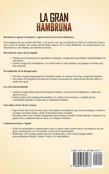 Descubra la saga de resistencia y supervivencia de La Gran Hambruna En las páginas de este esclarecedor libro, se le invita a un viaje a la década de 1840, al corazón de la época más oscura de Irlanda. Sea testigo del profundo impacto de la Gran Hambruna, un acontecimiento que transformó no sólo Irlanda, sino también el mundo. Descubra las raíces de la tragedia Adéntrese en la historia de la agricultura en Irlanda y comprenda las profundas vulnerabilidades de esta nación. Explore el auge del colonialismo y su control sobre la vida irlandesa, que preparó el terreno para una catástrofe. El catalizador de la desesperanza Descubra el papel fundamental de la humilde patata, el sustento de la clase campesina irlandesa. Sea testigo de la llegada de la plaga de la patata, un presagio de catástrofe que diezmó cultivos y sueños por igual. La crisis mal gestionada Analice la inadecuada respuesta del Imperio británico, una mezcla de negligencia y apatía que agravó la crisis. Sienta el pulso de la indignación mundial y los esfuerzos de asistencia, a medida que las comunidades globales se unían ante el sufrimiento humano. Una onda a través de los océanos Siga el rastro del éxodo de entre uno y dos millones de irlandeses que buscaron refugio y un nuevo comienzo en tierras lejanas, desde Norteamérica hasta Australia. Descubra cómo estos valientes inmigrantes dieron forma a Estados Unidos durante y después de la guerra civil y sembraron nuevas raíces en el Imperio británico. Conmemoraciones y legado Visite los monumentos conmemorativos que se erigen como conmovedores recordatorios de esta época, manteniendo vivo el recuerdo a través de las generaciones. Reflexione sobre el largo camino hacia la recuperación y sobre cómo la plaga cambió irrevocablemente Irlanda, Estados Unidos y la salud pública. Este libro no es sólo un recuento de la historia; es también un tributo al espíritu indomable de un pueblo que se enfrentó a una adversidad inimaginable. Su historia es un testimonio de la resistencia humana y un faro de esperanza que brilla en los momentos más oscuros.