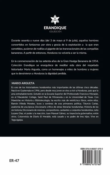 Durante sesenta y nueve días (del 3 de mayo al 9 de julio), aquellos hombres convertidos en fantasmas por obra y gracia de la explotación a la que eran sometidos, pusieron de rodillas al gigante de las transnacionales de las compañías bananeras. A partir de entonces, Honduras no volvería a ser la misma. En la conmemoración de los setenta años de la Gran Huelga Bananera de 1954, Colección Erandique se enorgullece de reeditar esta obra del respetado historiador Mario Argueta, como un homenaje a miles de hombres y mujeres que le devolvieron a Honduras la dignidad perdida.