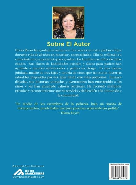 En La Gran Mentira de Dinosaurio, Frankie es un buen chico que encuentra la oportunidad de vengarse de su rival Patrick. La decisión de Frankie de conseguirlo, lo lleva a enfrentar el día más terrible y horrible de su vida y aprende valiosas lecciones. Sobre El Autor Diana Reyes ha ayudado a enriquecer las relaciones entre padres e hijos durante más de 26 años en escuelas y comunidades. Ella ha utilizado su conocimiento y experiencia para ayudar a las familias con niños de todas edades. Sus clases de habilidades sociales y clases para padres han ayudado a muchos adolescentes y padres en riesgo. Es una esposa jubilada, madre de tres hijos y abuela de cinco que ha escrito historias infantiles inspiradas por sus hijos desde que eran pequeños. Durante décadas, sus historias animadas y aventureras han entretenido a los niños y les han enseñado valiosas lecciones. Ha recibido múltiples premios y reconocimientos por su servicio y dedicación a la educación y la comunidad. "En medio de los escombros de la pobreza, bajo un manto de desesperación, puede haber una joya preciosa esperando ser pulida". - Diana Reyes