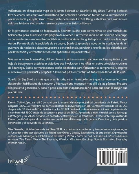 Adéntrate en el inspirador viaje de la joven Scarlett en Scarlett's Big Shot: Turning Setback Into Success, una conmovedora historia que entrelaza poderosos temas como la resiliencia, la perseverancia y el optimismo. Como parte de la serie Left of Bang, este libro para niños no es solo una historia, sino una herramienta para crear futuros líderes. En la pintoresca ciudad de Maplewood, Scarlett sueña con convertirse en una estrella del baloncesto, pero su camino está plagado de reveses. Su fracaso inicial en las pruebas del equipo se convierte en un momento crucial de autodescubrimiento, guiado por su padre que la apoya, Aaron. Por medio de la sabiduría de su padre, Scarlett aprende a adoptar las cualidades de un guerrero de todos los días: recuperarse con resiliencia, persistir a través de los desafíos con perseverancia y enfrentar la vida con optimismo inquebrantable. Más que una simple narrativa, el libro ofrece a padres y maestros conversaciones guiadas y una hoja de trabajo para establecer objetivos que involucren a los niños en estos principios cruciales de liderazgo. Estas conversaciones están diseñadas para fomentar la comprensión, inspirar el crecimiento personal y preparar a los niños para enfrentar los futuros desafíos de la vida. Scarlett's Big Shot es más que una historia; es un trampolín para que los jóvenes lectores desarrollen habilidades de carácter y liderazgo que resuenen más allá de las páginas. Prepare a la próxima generación, paso a paso con esta inspiradora serie para que sean lo mejor que puedan ser.