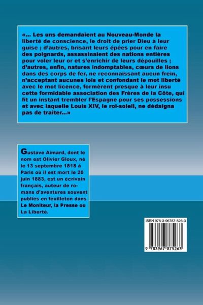 ... Les uns demandaient au Nouveau-Monde la liberté de conscience, le droit de prier Dieu à leur guise ; d'autres, brisant leurs épées pour en faire des poignards, assassinaient des nations entières pour voler leur or et s'enrichir de leurs dépouilles ; d'autres, enfin, natures indomptables, c¿urs de lions dans des corps de fer, ne reconnaissant aucun frein, n'acceptant aucunes lois et confondant le mot liberté avec le mot licence, formèrent presque à leur insu cette formidable association des Frères de la Côte, qui fit un instant trembler l'Espagne pour ses possessions et avec laquelle Louis XIV, le roi-soleil, ne dédaigna pas de traiter...