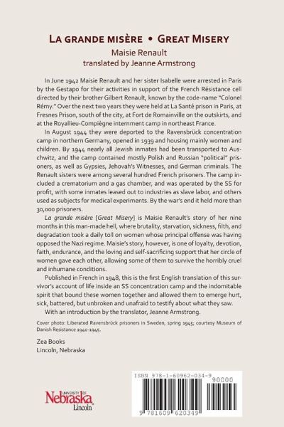 In 1942 Maisie Renault and her sister were arrested by the Gestapo for their work with the French Resistance. They were eventually deported to the Ravensbrück concentration camp in Germany, housing mainly women and children. The camp included a crematorium and a gas chamber, and was operated by the SS for profit, with inmates leased out to industries as slave labor, and used as subjects for medical experiments. By the war's end it held more than 30,000 prisoners. La grande misère is Maisie Renault's story of her nine months in this man-made hell, where brutality, starvation, sickness, filth, and degradation took a daily toll on women whose main offense was having opposed the Nazis. Maisie's story is one of loyalty, devotion, faith, endurance, and the loving and self-sacrificing support that the women gave each other, allowing some to survive the horribly cruel conditions and to testify what they saw. Jeanne Armstrong provides the first English translation of this gripping narrative.