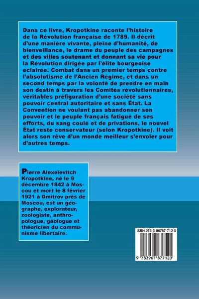 Dans ce livre, Kropotkine raconte l'histoire de la Révolution française de 1789. Il décrit d'une manière vivante, pleine d'humanité, de bienveillance, le drame du peuple des campagnes et des villes soutenant et donnant sa vie pour la Révolution dirigée par l'élite bourgeoise éclairée. Combat dans un premier temps contre l'absolutisme de l'Ancien Régime, et dans un second temps par la volonté de prendre en main son destin à travers les Comités révolutionnaires, véritables préfiguration d'une société sans pouvoir central autoritaire et sans État. La Convention ne voulant pas abandonner son pouvoir et le peuple français fatigué de ses efforts, du sang coulé et de privations, le nouvel État reste conservateur (selon Kropotkine). Il voit alors son rêve d'un monde meilleur s'envoler pour d'autres temps.