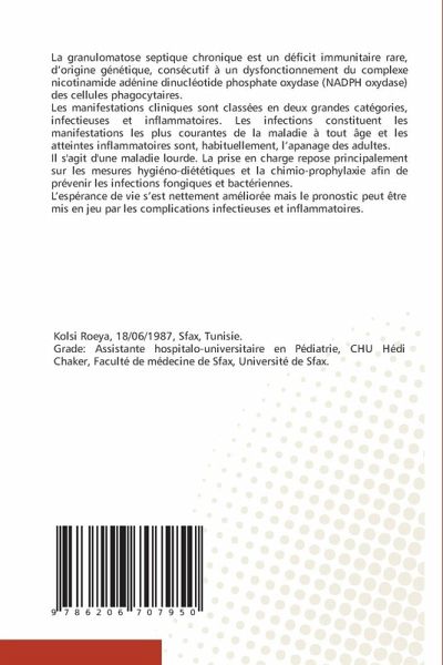La granulomatose septique chronique est un déficit immunitaire rare, d'origine génétique, consécutif à un dysfonctionnement du complexe nicotinamide adénine dinucléotide phosphate oxydase (NADPH oxydase) des cellules phagocytaires. Les manifestations cliniques sont classées en deux grandes catégories, infectieuses et inflammatoires. Les infections constituent les manifestations les plus courantes de la maladie à tout âge et les atteintes inflammatoires sont, habituellement, l'apanage des adultes. Il s'agit d'une maladie lourde. La prise en charge repose principalement sur les mesures hygiéno-diététiques et la chimio-prophylaxie afin de prévenir les infections fongiques et bactériennes. L'espérance de vie s'est nettement améliorée mais le pronostic peut être mis en jeu par les complications infectieuses et inflammatoires.