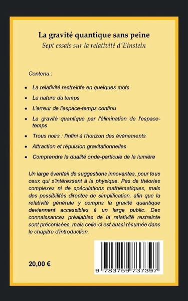 Un large éventail de suggestions innovantes, pour tous ceux qui s'intéressent à la physique. Pas de théories complexes ni de spéculations mathématiques, mais des possibilités directes de simplification, afin que la relativité générale y compris la gravité quantique deviennent accessibles à un large public. Des connaissances préalables de la relativité restreinte sont préconisées, mais celle-ci est aussi résumée dans le chapitre d'introduction.Contenu :- La relativité restreinte en quelques mots- La nature du temps- L'erreur de l'espace-temps continu- La gravité quantique par l'élimination de l'espace-temps- Trous noirs : l'infini à l'horizon des événements- Attraction et répulsion gravitationnelles- Comprendre la dualité onde-particule de la lumière