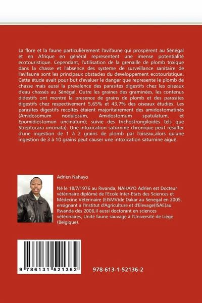 La flore et la faune particulièrement l'avifaune qui prospèrent au Sénégal et en Afrique en général representent une imense potentialité ecotouristique. Cependant, l'utilisation de la grenaille de plomb toxique dans la chasse et l'absence des systeme de surveillance sanitaire de l'avifaune sont les principaux obstacles du developpement ecotouristique. Cette étude avait pour but d'evaluer le danger que represente le plomb de chasse mais aussi la prevalence des parasites digestifs chez les oiseaux d'eau chassés au Sénégal. Outre les graines des graminées, les contenus didestifs ont montré la presence de grains de plomb et des parasites digestifs chez respectivement 5,65% et 43,7% des oiseaux étudiés. Les parasites digestifs recoltés étaient majoritairement des amidostomatinés (Amidosomum nodulosum, Amidostomum spatulatum, et Epomidiostomun uncinatum); suivie des trichostrongiloidés tels que Streptocara uncinata). Une intoxication saturnine chronique peut resulter d'une ingestion de 1 à 2 grains de plomb par l'oiseau,alors qu'une ingestion de 3 à 10 grains peut causer une intoxication saturnine aiguë.