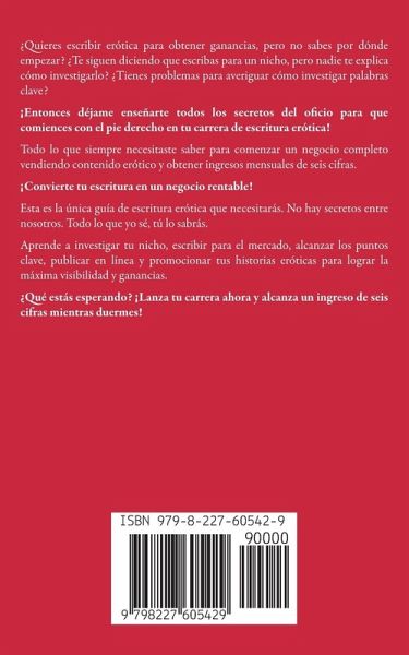 ¿Quieres escribir erótica para obtener ganancias, pero no sabes por dónde empezar? ¿Te siguen diciendo que escribas para un nicho, pero nadie te explica cómo investigarlo? ¿Tienes problemas para averiguar cómo investigar palabras clave? ¡Entonces déjame enseñarte todos los secretos del oficio para que comiences con el pie derecho en tu carrera de escritura erótica! Todo lo que siempre necesitaste saber para comenzar un negocio completo vendiendo contenido erótico y obtener ingresos mensuales de seis cifras. ¡Convierte tu escritura en un negocio rentable! Esta es la única guía de escritura erótica que necesitarás. No hay secretos entre nosotros. Todo lo que yo sé, tú lo sabrás. Aprende a investigar tu nicho, escribir para el mercado, alcanzar los puntos clave, publicar en línea y promocionar tus historias eróticas para lograr la máxima visibilidad y ganancias. ¿Qué estás esperando? ¡Lanza tu carrera ahora y alcanza un ingreso de seis cifras mientras duermes!