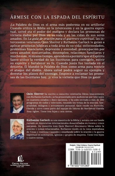 La Gü¿a de Oraci¿¿n del Guerrero Espiritual es ideal para las personas que se encuentran en la b¿¿squeda de estrategias para generar cambios en su familia o en su situaci¿¿n personal. Este libro es una gran fuente de sabidur¿¿a y contiene poderosas armas espirituales fundamentadas en las Escrituras, armas para lograr una transformaci¿¿n a trav¿¿s de la oraci¿¿n. En La Gü¿a de Oraci¿¿n del Guerrero Espiritual aprender¿¿s a aplicar las promesas b¿¿blicas en cada ¿¿rea de la vida: enfermedades, problemas econ¿¿micos, depresi¿¿n, preocupaci¿¿n por los seres queridos rebeldes, desempleo, y confusi¿¿n espiritual. La presente es una versi¿¿n revisada y mejorada de la primera edici¿¿n, las autoras Quin Sherrer y Ruthanne Garlock comparten estas oraciones con el fin de liberar a individuos y transformar territorios para la expansi¿¿n del reino de Dios. Incluye: Oraciones para el guerrero espiritual. Vers¿¿culos del Antiguo y Nuevo Testamento. Traducci¿¿n por Enrique Chi. Citas B¿¿blicas: la Reina Valera 1960 (RVR1960). The Spiritual Warrior's Prayer Guide The Spiritual Warrior's Prayer Guide is ideal for people who are in search of strategies to generate changes in their family or in their personal situation. This book is a great source of wisdom and contains powerful spiritual weapons grounded in Scripture, weapons to help achieve transformation through prayer. In The Spiritual Warrior's Prayer Guide you will learn to apply biblical promises in every life area: illness, financial problems, depression, concern for unruly loved ones, unemployment, and spiritual confusion. This is a revised and improved version of the first edition, the authors Quin Sherrer and Ruthanne Garlock share these prayers in order to liberate individuals and transform territories for the expansion of the kingdom of God. It includes: ? Prayers for the spiritual warrior. ? Old and New Testament verses. ? Translation by Enrique Chi. ? Scripture quotes: la Reina Valera 1960 (RVR1960).