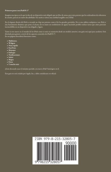 Primeros pasos con iPadOS 17 Imagina una época en la que la idea de un dispositivo más delgado que un bloc de notas, pero más potente que los ordenadores de sobremesa de antaño, parecía un sueño descabellado. Ese sueño es ahora una realidad tangible con el iPad. En el elegante diseño del iPad se esconde un chip tan potente como el de los grandes portátiles. No es una tableta cualquiera; este iPad es una herramienta dinámica que pone al alcance de tu mano un rendimiento sin igual, haciendo posible realizar tareas que antes parecían inconcebibles en un dispositivo tan delgado y ligero. Tanto si eres nuevo en el mundo de los iPads como si estás en transición desde un modelo anterior, esta guía está aquí para ayudarte. Está diseñada para guiarte a través de los aspectos esenciales de iPadOS 17. En sus páginas descubrirá funciones como:Multitarea Widgets Nota rápida FaceTime Mensajes Enfoque Notificaciones Safari Mapas Fotos Y mucho más ¿Estás deseando sacar el máximo partido a tu nuevo iPad? Sumérgete en él. Esta guía no está avalada por Apple, Inc. y debe considerarse no oficial.