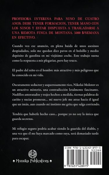 Profesora interina para niño de cuatro años. Debe tener formación, tener mano con los niños y estar dispuesta a trasladarse a una remota finca de montaña. 3.000 $/semana en efectivo. Cuando veo ese anuncio, en plena huida de unos asesinos despiadados, solo me quedan diez pavos en el bolsillo y medio depósito de gasolina en mi viejísimo coche. Este trabajo suena como la respuesta a mis plegarias, pero hay truco. El padre del niño es el hombre más atractivo y más peligroso que he conocido en mi vida. Oscuramente seductor y asquerosamente rico, Nikolai Molotov es un atractivo misterio, una contradicción letalmente fascinante. Nudillos amoratados y trajes hechos a medida, tiernas palabras de cariño y sucias promesas... mi nuevo jefe me atrae hacia él igual que un imán, aun cuando mi instinto me grita que salga corriendo. Tendría que haberle hecho caso... porque yo no soy la única que guarda secretos. Mi refugio seguro podría acabar siendo la guarida del diablo, y una vez que él me haya marcado como suya, será demasiado tarde para escapar.