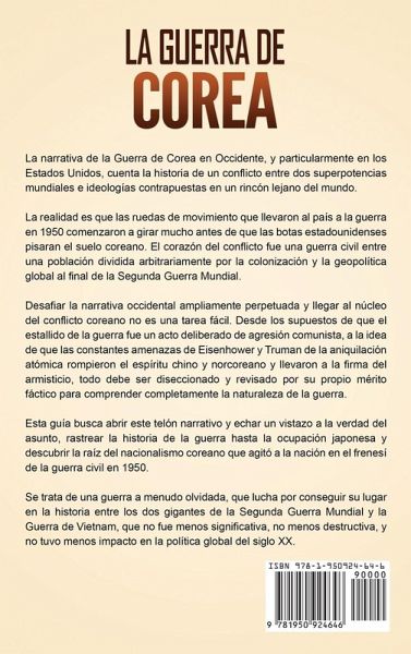Explore cómo comenzó la Guerra de Corea, las consecuencias y los acontecimientos intermedios La narrativa de la Guerra de Corea en Occidente, y particularmente en los Estados Unidos, cuenta la historia de un conflicto entre dos superpotencias mundiales e ideologías contrapuestas en un rincón lejano del mundo. La realidad es que las ruedas de movimiento que llevaron al país a la guerra en 1950 comenzaron a girar mucho antes de que las botas estadounidenses pisaran el suelo coreano. El corazón del conflicto fue una guerra civil entre una población dividida arbitrariamente por la colonización y la geopolítica global al final de la Segunda Guerra Mundial. Desafiar la narrativa occidental ampliamente perpetuada y llegar al núcleo del conflicto coreano no es una tarea fácil. Desde los supuestos de que el estallido de la guerra fue un acto deliberado de agresión comunista, a la idea de que las constantes amenazas de Eisenhower y Truman de la aniquilación atómica rompieron el espíritu chino y norcoreano y llevaron a la firma del armisticio, todo debe ser analizado y revisado por su propio mérito fáctico para comprender plenamente la naturaleza de la guerra. Esta guía busca abrir este telón narrativo y echar un vistazo a la verdad del asunto, rastrear la historia de la guerra hasta la ocupación japonesa y descubrir la raíz del nacionalismo coreano que agitó a la nación en el frenesí de la guerra civil en 1950. Se trata de una guerra a menudo olvidada, luchando por su lugar en la historia entre los dos gigantes de la Segunda Guerra Mundial y la Guerra de Vietnam, que no fue menos significativa, no menos destructiva, y no tuvo menos impacto en la política global del siglo XX. Algunos de los temas tratados en este libro incluyen: La Ascendencia Japonesa: 1910-1945 Una Corea Dividida: La Ocupación Estadounidense del Sur La Forja del Estado Norcoreano Primera Sangre: El Estallido de La Guerra Golpea Fuerte y Hazlo Rápido: La Retirada de los Estados Unidos Victorias Agridulces: El Renacimiento Estadounidense y La Decisión de China de Cruzar El Yalu ¿Cómo Resolver Un Problema Como China? El Cese al Fuego Sangriento y La Bomba que se Avecina El Legado de la Guerra de Corea A¡Y Mucho Más Que No Querrá Perderse! ¡Obtenga este libro ahora para aprender más sobre la guerra de Corea!