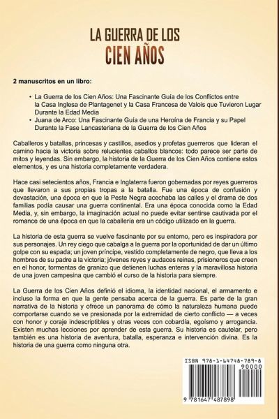 2 manuscritos completos en 1 libroLa Guerra de los Cien Años: Una Fascinante Guía de los Conflictos entre la Casa Inglesa de Plantagenet y la Casa Francesa de Valois que Tuvieron Lugar Durante la Edad Media Juana de Arco: Una Fascinante Guía de una Heroína de Francia y su Papel Durante la Fase Lancasteriana de la Guerra de los Cien Años Caballeros y batallas, princesas y castillos, asedios y profetas guerreros que lideran el camino hacia la victoria sobre relucientes caballos blancos: todo parece ser parte de mitos y leyendas. Sin embargo, la historia de la Guerra de los Cien Años contiene estos elementos, y es una historia completamente verdadera. La historia de esta guerra se vuelve fascinante por su entorno, pero es inspiradora por sus personajes. Un rey ciego que cabalga a la guerra por la oportunidad de dar un último golpe con su espada; un joven príncipe, vestido completamente de negro, que lleva a los hombres de su padre a la victoria; jóvenes reyes y audaces reinas, prisioneros que creen en el honor, tormentas de granizo que detienen luchas enteras y la maravillosa historia de una joven campesina que cambió el curso de la historia para siempre. La Guerra de los Cien Años definió el idioma, la identidad nacional, el armamento e incluso la forma en que la gente pensaba acerca de la guerra. Es parte de la gran narrativa de la historia y ofrece un panorama de cómo la naturaleza humana puede comportarse cuando se ve presionada por la extremidad de cierto conflicto - a veces con honor y coraje indescriptibles y otras veces con cobardía, egoísmo y arrogancia. Existen muchas lecciones por aprender de esta guerra. Su historia es cautelar, pero también es una historia de aventura, batalla, esperanza e intervención divina. Es la historia de una guerra como ninguna otra. La primera parte de este libro incluye:La Guerra Eduardiana (1337-1360) Una Cuestión de Sucesión Dando el Primer Golpe Muerte de una Clase Diferente La Incursión del Príncipe Negro El Tratado de Brétigny La Guerra Carolina (1369-1389) Carlos el Sabio La Muerte de John Chandos La Victoria Francesa El Gran Chevauchée Dos Jóvenes Reyes Locura y Destitución La Guerra de Lancaster (1415-1453) Asedio a Harfleur La Batalla de Azincourt Un Bebé Rey Juana y el Asedio Las Últimas Batallas ¡Y mucho, mucho más! Segunda parte de este libro, usted:La Guerra Interminable Una Profecía Susurrada La Primera Visión La Duda de Baudricourt Una Predicción de Derrota Una Audiencia con el Rey El Camino a Orleans Llegada a Orleans Portando el Estandarte Blanco Una señal Provista La Batalla de Patay Habas para el Apocalipsis El Rey Francés Coronado El Asedio de París Paz Captura Cautiva Una Santa Juzgada por Herejía La quema de Juana de Arco ¡Y mucho, mucho más! ¡Obtenga este libro ahora para conocer más sobre La Guerra de los Cien Años y Juana de Arco!