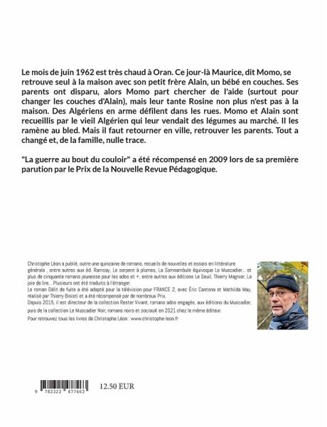 Le mois de juin 1962 est très chaud à Oran. Ce jour-là Maurice, dit Momo, se retrouve seul à la maison avec son petit frère Alain, un bébé en couches. Ses parents ont disparu, alors Momo part chercher de l'aide (surtout pour changer les couches d'Alain), mais leur tante Rosine non plus n'est pas à la maison. Des Algériens en arme défilent dans les rues. Momo et Alain sont recueillis par le vieil Algérien qui leur vendait des légumes au marché. Il les ramène au bled. Mais il faut retourner en ville, retrouver les parents. Tout a changé et, de la famille, nulle trace. "La guerre au bout du couloir" a été récompensé en 2009 lors de sa première parution par la Prix de la Nouvelle Revue Pédagogique.