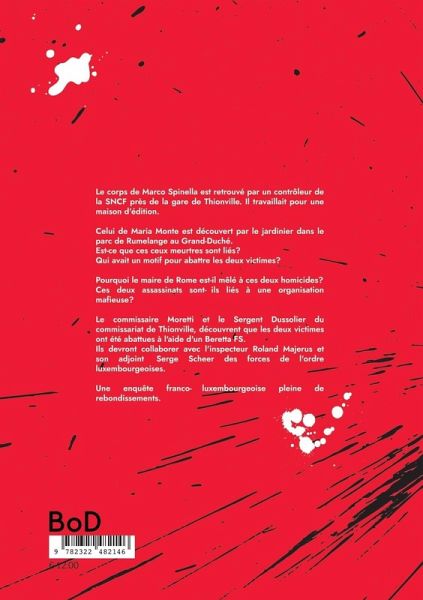 SynopsisLe corps de Marco Spinella est retrouvé par un contrôleur de la SNCF près de la gare de Thionville. Il travaillait pour une maison d'édition.Celui de Maria Monte est découvert par le jardinier dans le parc de Rumelange au Grand-Duché.Est-ce que ces ceux meurtres sont liés? Qui avait un motif pour abattre les deux victimes?Pourquoi le maire de Rome est-il mêlé à ces deux homicides?Ces deux assassinats sont-ils liés à une organisation mafieuse?Le commissaire Moretti et le Sergent Dussolier découvrent que les deux victimes ont été abattues à l'aide d'un Beretta FS.Ils devront collaborer avec l'inspecteur Roland Majerus et son adjoint Serge Scheer des forces de l'ordre luxembourgeoises.Une enquête franco-luxembourgeoise pleine de rebondissements.