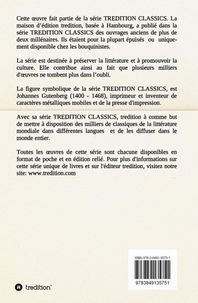 Cette uvre fait partie de la série TREDITION CLASSICS. La maison d édition tredition, basée à Hambourg, a publié dans la série TREDITION CLASSICS des ouvrages anciens de plus de deux millénaires. Ils étaient pour la plupart épuisés ou unique-ment disponible chez les bouquinistes. La série est destinée à préserver la littérature et à promouvoir la culture. Avec sa série TREDITION CLASSICS, tredition à comme but de mettre à disposition des milliers de classiques de la littérature mondiale dans différentes langues et de les diffuser dans le monde entier.