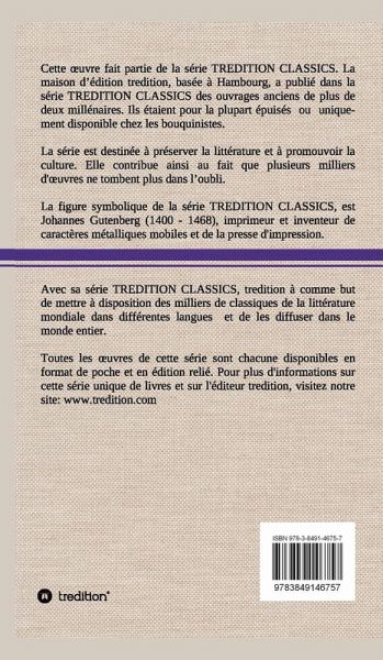 Cette uvre (édition relié) fait partie de la série TREDITION CLASSICS. La maison d édition tredition, basée à Hambourg, a publié dans la série TREDITION CLASSICS des ouvrages anciens de plus de deux millénaires. Ils étaient pour la plupart épuisés ou uniquement disponible chez les bouquinistes. La série est destinée à préserver la littérature et à promouvoir la culture. Avec sa série TREDITION CLASSICS, tredition à comme but de mettre à disposition des milliers de classiques de la littérature mondiale dans différentes langues et de les diffuser dans le monde entier.