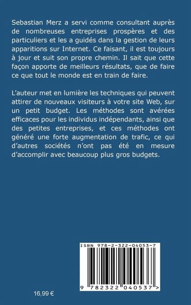 Sebastian Merz a servi comme consultant auprès de nombreuses entreprises prospères et des particuliers et les a guidés dans la gestion de leurs apparitions sur Internet. Ce faisant, il est toujours à jour et suit son propre chemin. Il sait que cette façon apporte de meilleurs résultats, que de faire ce que tout le monde est en train de faire.L'auteur met en lumière les techniques qui peuvent attirer de nouveaux visiteurs à votre site Web, sur un petit budget. Les méthodes sont avérées efficaces pour les individus indépendants, ainsi que des petites entreprises, et ces méthodes ont généré une forte augmentation de trafic, ce qui d'autres sociétés n'ont pas été en mesure d'accomplir avec beaucoup plus gros budgets.