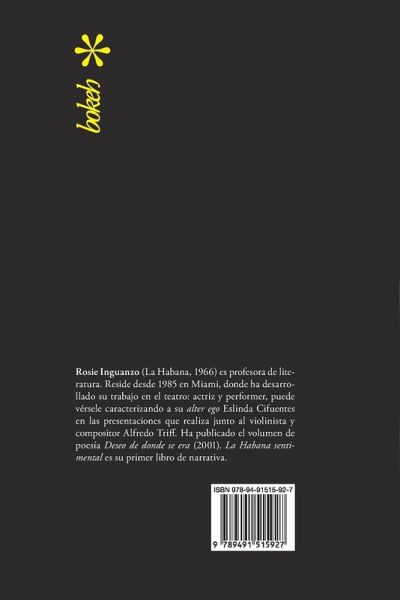 Rosie Inguanzo (La Habana, 1966) es profesora de literatura. Reside desde 1985 en Miami, donde ha desarrollado su trabajo en el teatro: actriz y performer, puede vérsele caracterizando a su alter ego Eslinda Cifuentes en las presentaciones que realiza junto al violinista y compositor Alfredo Triff. Ha publicado el volumen de poesía Deseo de donde se era (2001). La Habana sentimental es su primer libro de narrativa.