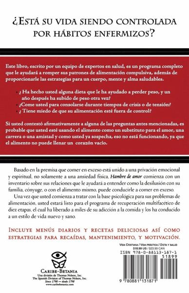 Basado en la premisa que comer en exceso est¿¿ unido a una privaci¿¿n emocional y espiritual, no solamente a una ansiedad f¿¿sica, Hambre de amor comienza con un inventario sobre sus relaciones que le ayudar¿¿ a entender como la desilusi¿¿n con su familia, c¿¿nyuge, o con el alimento mismo, puede conducirle a comer en exceso. Este libro le proveer¿¿ un programa completo que le servir¿¿ para identificar si usted est¿¿ utilizando el alimento como un sustituto para el amor, la realizaci¿¿n de una carrera, o la amistad; d¿¿ndole entonces, una forma para romper esa adicci¿¿n. Una vez que usted comience a tratar con la base psicol¿¿gica de sus problemas alimenticios, usted estar¿¿ listo para perder peso de manera saludable mediante un plan dise¿¿ado por nutricionistas profesionales, que incluye men¿¿s diarios y recetas. Este programa tambi¿¿n ofrece estrategias para cuando ocurran recä¿das, mantener el programa, motivaci¿¿n, y mucho m¿¿s. Este es un plan integral para el cuerpo, la mente, y el alma.