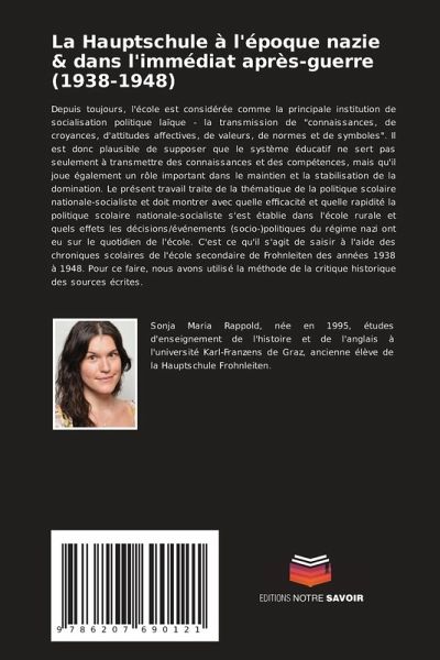 Depuis toujours, l'école est considérée comme la principale institution de socialisation politique laïque - la transmission de "connaissances, de croyances, d'attitudes affectives, de valeurs, de normes et de symboles". Il est donc plausible de supposer que le système éducatif ne sert pas seulement à transmettre des connaissances et des compétences, mais qu'il joue également un rôle important dans le maintien et la stabilisation de la domination. Le présent travail traite de la thématique de la politique scolaire nationale-socialiste et doit montrer avec quelle efficacité et quelle rapidité la politique scolaire nationale-socialiste s'est établie dans l'école rurale et quels effets les décisions/événements (socio-)politiques du régime nazi ont eu sur le quotidien de l'école. C'est ce qu'il s'agit de saisir à l'aide des chroniques scolaires de l'école secondaire de Frohnleiten des années 1938 à 1948. Pour ce faire, nous avons utilisé la méthode de la critique historique des sources écrites.