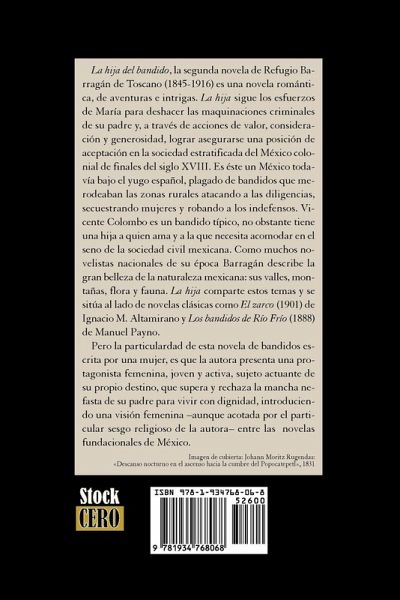 La hija del bandido o los subterraneos del Nevado (1887) is Refugio de Barragan de Toscano's second novel. Full of adventure and intrigue this romantic text follows María as she tries to undo her bandit father's misdeeds and through actions of courage and kindness earn a position in the highly class-stratified society of late eighteenth century Mexico. During this time Mexico was still a colony of Spain and the novel depicts how the soon-to-be nation was ravaged by marauding bandits that terrorized the countryside. They kidnapped women, assaulted stagecoaches and robbed unarmed, defenseless travelers. Vicente Colombo is the typical bandit leader, except for one thing- he has a daughter whom he loves and must somehow accommodate in social society. In keeping with the theme of many national novels of the era Barragan limns the beauty of the Mexican countryside- its valleys, mountains, flora and fauna. La hija should be read alongside Mexican bandit classics such as Ignacio Altamirano's El zarco (1901), and Manuel Payno's Los bandidos de Río Frío (1888). The exceptionality of this bandit novel written by a nineteenth-century Mexican woman is her portrayal of the female protagonist as an independent, active young woman who takes charge of her destiny and overcomes the social stain of being a criminal's daughter. In her novel Barragán, portrays María not as a subservient subject but as a willful actor who wants to live with dignity, thus introducing a unique proto-feminist nationalist vision- though marked by the author's religious tendencies- within Mexico's foundational fictions.