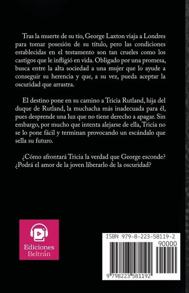Tras la muerte de su tío, George Laxton viaja a Londres para tomar posesión de su título, pero las condiciones establecidas en el testamento son tan crueles como los castigos que le infligió en vida. Obligado por una promesa, busca entre la alta sociedad a una mujer que lo ayude a conseguir su herencia y que, a su vez, pueda aceptar la oscuridad que arrastra. El destino pone en su camino a Tricia Rutland, hija del duque de Rutland, la muchacha más inadecuada para él, pues desprende una luz que no tiene derecho a apagar. Sin embargo, por mucho que intenta alejarse de ella, Tricia no se lo pone fácil y terminan provocando un escándalo que sella su futuro. ¿Cómo afrontará Tricia la verdad que George esconde? ¿Podrá el amor de la joven liberarlo de la oscuridad?