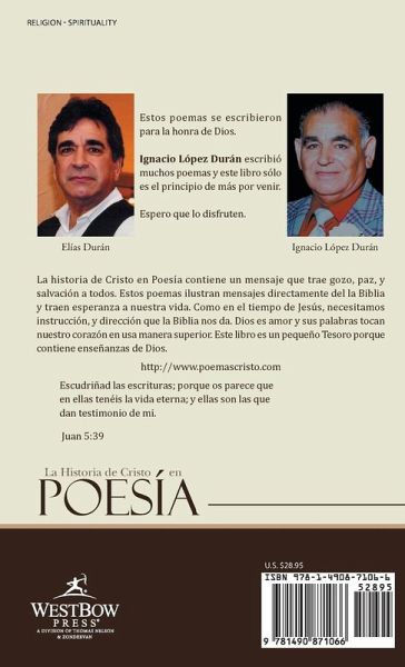 La historia de Cristo en Poesía contiene un mensaje que trae gozo, paz, y salvasion a todos. Estos poemas ilustran mensajes directamente de la Biblia y traen esperanza a nuestra vida. Como en el tiempo de Jesús, necesitamos instrucción, y dirección que la Biblia nos da. Dios es amor y sus palabras tocan nuestro corazón en usa manera superior. Este libro es un pequeño Tesoro porque contiene enseñanzas de Dios. http://www.poemascristo.com Escudriñad las escrituras; porque os parece que en ellas tenéis la vida eterna; y ellas son las que dan testimonio de mi. Juan 5:39