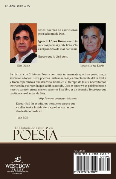 La historia de Cristo en Poesía contiene un mensaje que trae gozo, paz, y salvasion a todos. Estos poemas ilustran mensajes directamente de la Biblia y traen esperanza a nuestra vida. Como en el tiempo de Jesús, necesitamos instrucción, y dirección que la Biblia nos da. Dios es amor y sus palabras tocan nuestro corazón en usa manera superior. Este libro es un pequeño Tesoro porque contiene enseñanzas de Dios. http://www.poemascristo.com Escudriñad las escrituras; porque os parece que en ellas tenéis la vida eterna; y ellas son las que dan testimonio de mi. Juan 5:39