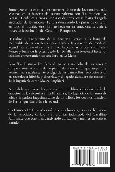 Sumérgete en la cautivadora narrativa de uno de los nombres más icónicos en la historia del automovilismo con "La Historia De Ferrari." Desde los sueños visionarios de Enzo Ferrari hasta el rugido atronador de los motores Ferrari dominando las pistas de carreras en todo el mundo, este libro te lleva en un emocionante viaje a través de la evolución del Cavallino Rampante. Descubre el nacimiento de la Scuderia Ferrari y la búsqueda incansable de la excelencia que llevó a la creación de modelos legendarios como el 125 S y el F40. Explora las feroces rivalidades dentro y fuera de la pista, desde las batallas con Maserati hasta los icónicos enfrentamientos con Ford en Le Mans. Pero "La Historia De Ferrari" no se trata solo de victorias y campeonatos; se trata del espíritu de innovación que impulsa a Ferrari hacia adelante. Sé testigo de los desarrollos revolucionarios en tecnología híbrida y eléctrica, y el legado duradero de maestros de la ingeniería como Mauro Forghieri. A medida que pasas las páginas de este libro, experimentarás la emoción de las victorias en la Fórmula 1, la elegancia de los autos de lujo, y la pasión inquebrantable de los Tifosi, los devotos fanáticos de Ferrari que dan vida a la leyenda. "La Historia De Ferrari" es más que una historia; es una celebración de la velocidad, el lujo y el espíritu indomable del Cavallino Rampante que continúa cautivando corazones y mentes en todo el mundo.