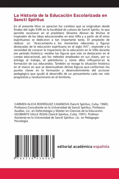 En el presente libro se aprecian los cambios que se originaban desde finales del siglo XVlll en la localidad de cubana de Sancti Spíritu, lo que permite reconocer en el presbítero Silvestre Alonso de Muñoz el inspirador de las ideas educacionales en esta Villa y a partir de él otros espirituanos se dedicaron a tan importante tarea. El propósito de realizar un "Acercamiento a los momentos relevantes y figuras destacadas de la educación espirituana en el siglo XIX", responde a la necesidad de conocer la trayectoria de la educación en la Villa durante ese período histórico; resaltar las figuras que más se destacaron en el campo educacional, por los métodos empleados en sus clases, por su entrega al trabajo, el patriotismo y cómo ellos influyeron en la formación de sus educandos. También se recoge la situación histórica en el marco en que se desenvuelven dichas figuras que conforman los puntos claves en la formación y desenvolvimiento del accionar pedagógico que ayudó al desarrollo de un pensamiento cada vez más progresista y revolucionario en el territorio.