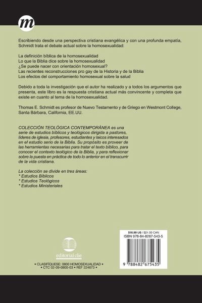 Escribiendo desde una perspectiva Cristiana evangelica y con una profunda empatia, Schmidt trata el debate actual sobre la homosexualidad: La definicion biblica de la homosexualidad; Lo que la Biblia dice sobre la homosexualidad; Se puede nacer con orientacion homosexual?; Las recientes reconstrucciones pro gay de la historia y de la Biblia; Los efectos del comportamiento homosexual sobre la salud. Debido a toda la investigacion que el autor ha realizado y a todos los argumentos que presenta, este libro es la respuesta Cristiana actual mas convincente y complete que existe en cuanto al tema de la homosexualidad.