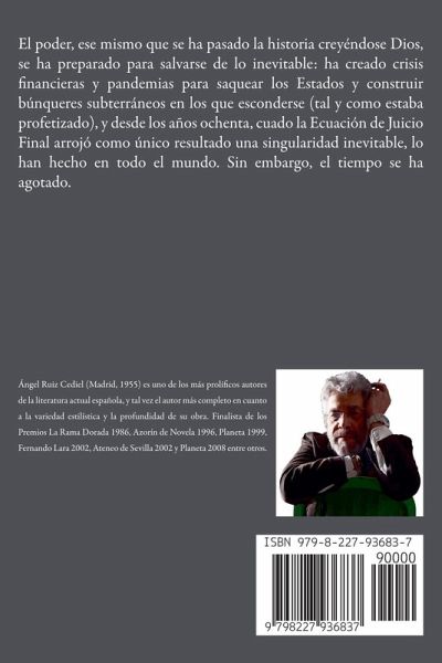 El poder, ese mismo que se ha pasado la historia creyéndose Dios, se ha preparado para salvarse de lo inevitable: ha creado crisis financieras y pandemias para saquear los Estados y construir búnqueres subterráneos en los que esconderse (tal y como estaba profetizado), y desde los años ochenta, cuado la Ecuación de Juicio Final arrojó como único resultado una singularidad inevitable, lo han hecho en todo el mundo. Sin embargo, el tiempo se ha agotado.