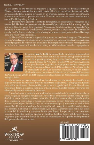 La idea central de este proyecto es impulsar a la Iglesia del Nazareno de South Mountain en Phoenix, Arizona a desarrollar una visión misional hacia la comunidad. Se animarán a diez hermanos voluntarios a que se involucren en un programa después de escuela para niños, con el propósito de llevar a la práctica esta visión. El escrito consta de tres partes centrales más la conclusión, bibliografía, y apéndices. La Primera Parte presenta el contexto demográfico, socioeconómico, y religioso de la comunidad. Habla de una encuesta sobre las necesidades académicas de los niños y describe una breve historia y datos de la Iglesia del Nazareno de South Mountain. La Segunda Parte desarrolla el aspecto bíblico y teológico del proyecto, así como la capacitación del liderazgo. Se estudian las Escrituras en relación con la misión y se presenta un plan para movilizar al liderazgo hacia una visión y acción misional. La Tercera Parte muestra la organización y puesta en marcha del programa "Después de Escuela." Con el equipo de voluntarios se ha organizado una junta para planificar los aspectos que hacen al programa. Se concluye con un recuento de las experiencias obtenidas en este proyecto y se explica la necesidad de desarrollar una visión y actividades misionales en las congregaciones.