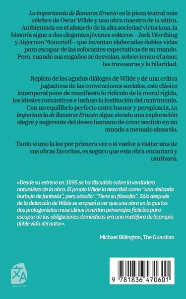 La importancia de llamarse Ernesto es la pieza teatral más célebre de Oscar Wilde y una obra maestra de la sátira. Ambientada en el absurdo de la alta sociedad victoriana, la historia sigue a dos elegantes jóvenes solteros -Jack Worthing y Algernon Moncrieff- que inventan elaboradas dobles vidas para escapar de las sofocantes expectativas de su mundo. Pero, cuando sus engaños se desvelan, sobrevienen el amor, las travesuras y la hilaridad. Repleto de los agudos diálogos de Wilde y de una crítica juguetona de las convenciones sociales, este clásico intemporal pone de manifiesto lo ridículo de la moral rígida, los ideales románticos e incluso la institución del matrimonio. Con un equilibrio perfecto entre humor y perspicacia, La importancia de llamarse Ernesto sigue siendo una exploración alegre y sugerente del deseo humano de crear sentido en un mundo a menudo absurdo. Tanto si uno la lee por primera vez o si vuelve a visitar una de sus obras favoritas, es seguro que esta obra encantará y cautivará.