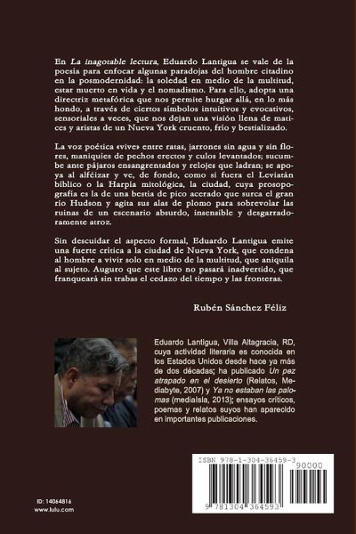 En La inagotable lectura, Eduardo Lantigua se vale de la poesía para enfocar algunas paradojas del hombre citadino en la posmodernidad: la soledad en medio de la multitud, estar muerto en vida y el nomadismo. Para ello, adopta una directriz metafórica que nos permite hurgar allá, en lo más hondo, a través de ciertos símbolos intuitivos y evocativos, sensoriales a veces, que nos dejan una visión llena de matices y aristas de un Nueva York cruento, frío y bestializado.
