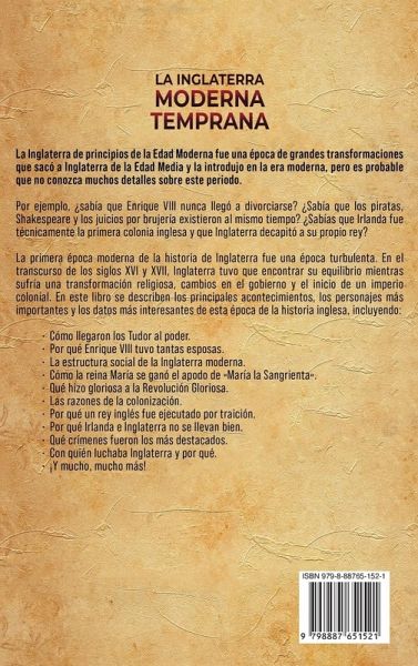 La Inglaterra de principios de la Edad Moderna fue una época de grandes transformaciones que sacó a Inglaterra de la Edad Media y la introdujo en la era moderna, pero es probable que no conozca muchos detalles sobre este periodo. Por ejemplo, ¿sabía que Enrique VIII nunca llegó a divorciarse? ¿Sabía que los piratas, Shakespeare y los juicios por brujería existieron al mismo tiempo? ¿Sabías que Irlanda fue técnicamente la primera colonia inglesa y que Inglaterra decapitó a su propio rey? La primera época moderna de la historia de Inglaterra fue una época turbulenta. En el transcurso de los siglos XVI y XVII, Inglaterra tuvo que encontrar su equilibrio mientras sufría una transformación religiosa, cambios en el gobierno y el inicio de un imperio colonial. En este libro se describen los principales acontecimientos, los personajes más importantes y los datos más interesantes de esta época de la historia inglesa, incluyendo: Cómo llegaron los Tudor al poder. Por qué Enrique VIII tuvo tantas esposas. La estructura social de la Inglaterra moderna. Cómo la reina María se ganó el apodo de María la Sangrienta. Qué hizo gloriosa a la Revolución Gloriosa. Las razones de la colonización. Por qué un rey inglés fue ejecutado por traición. Por qué Irlanda e Inglaterra no se llevan bien. Qué crímenes fueron los más destacados. Con quién luchaba Inglaterra y por qué. ¡Y mucho, mucho más!