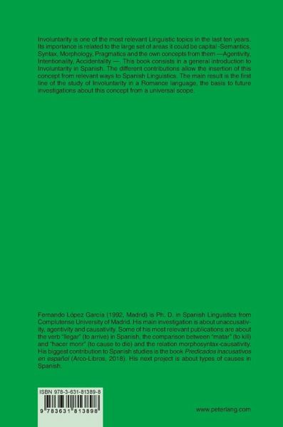 La Involuntariedad es uno de los temas lingüísticos más relevantes en los últimos diez años. Su importancia está ligada al amplio conjunto de áreas en las que puede ser capital -Semántica, Sintaxis, Morfología, Pragmática- y los propios conceptos que albergan -Agentividad, Intencionalidad, Accidentalidad-. Este libro es una introducción general al concepto de Involuntariedad en español. Las diferentes contribuciones permiten su inserción desde distintos enfoques relevantes para la Lingüística del español. El resultado es la primera línea de estudio de la Involuntariedad en una lengua romance, la base para futuras investigaciones de este concepto desde una perspectiva universal.