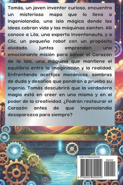 ✨ Un libro mágico que inspirará a tus hijos a imaginar, crear y soñar sin límites. En La Isla de los Inventonautas, Tomás, un joven inventor lleno de curiosidad, descubre un mapa que lo lleva a Ingeniolandia, un mundo donde las ideas cobran vida y la imaginación no tiene límites. Junto a Lila, una Inventonauta valiente, y Clic, un adorable robot, Tomás enfrentará desafíos llenos de ingenio, resolverá acertijos fascinantes y aprenderá el valor del trabajo en equipo para salvar el Corazón de la Isla.