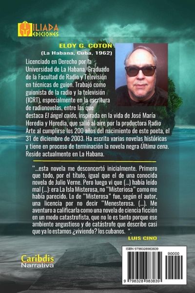 "...esta novela me desconcertó inicialmente. Primero que todo, por el título, igual que el de una conocida novela de Julio Verne. Pero luego vi que (...) había leído mal (...): era La Isla Misterosa, no "Misteriosa" como me había parecido. Lo de "Misterosa" fue, según el autor, una licencia por no decir "Menesterosa. (...). Me aventuro a calificarla como una novela de ciencia ficción en un modo catastrofista, que no lo es tanto porque ese ambiente angustioso y de catástrofe que describe casi que ya lo estamos ¿viviendo? los cubanos. ". (LUIS CINO, ESCRITOR Y PERIODISTA CUBANO) --***-- ELOY G. COTON (La Habana, Cuba, 1962) Licenciado en Derecho por la Universidad de La Habana. Graduado de la Facultad de Radio y Televisión en técnicas de guion. Trabajó como guionista de la radio y la televisión (ICRT), especialmente en la escritura de radionovelas, entre las que destaca El ángel caído, inspirada en la vida de José María Heredia y Heredia, que salió al aire por la productora Radio Arte al cumplirse los 200 años del nacimiento de este poeta, el 31 de diciembre de 2003. Ha escrito varias novelas históricas y tiene en proceso de terminación la novela negra Última cena. Reside actualmente en La Habana.