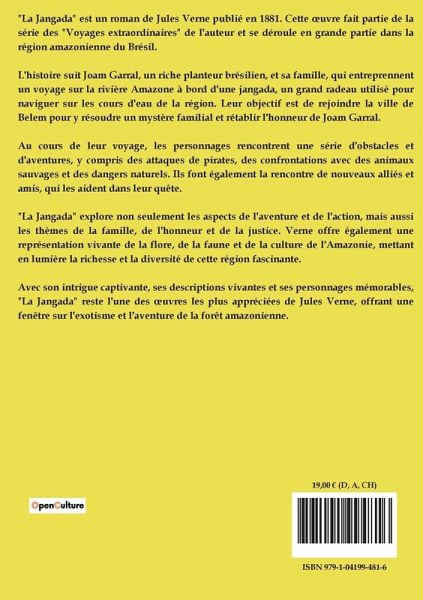 "La Jangada: Huit cent lieues sur l'Amazone" de Jules Verne est un roman d'aventure qui se déroule principalement le long du fleuve Amazone. L'histoire commence avec le capitaine des bois, Torrès, qui possède un document crypté d'une importance capitale. Ce document pourrait changer la vie de Joam Garral, un fazender respecté vivant près d'Iquitos, au Pérou. Joam Garral, qui a trouvé refuge et prospérité à la fazenda après avoir quitté le Brésil, est un homme de principes, mais il cache un passé mystérieux. Sa famille, composée de sa femme Yaquita, de son fils Benito et de sa fille Minha, vit dans l'harmonie et la prospérité. Cependant, un projet de mariage entre Minha et Manoel Valdez, un jeune médecin et ami de Benito, pousse la famille à envisager un voyage au Brésil pour célébrer l'union. Ce voyage pourrait être l'occasion pour Joam de confronter son passé. Torrès, qui a ses propres intentions, voit dans ce voyage une opportunité de tirer profit du secret qu'il détient. Le roman explore les thèmes de la famille, de l'honneur et du mystère, tout en offrant une description vivante de la vie le long de l'Amazone.
