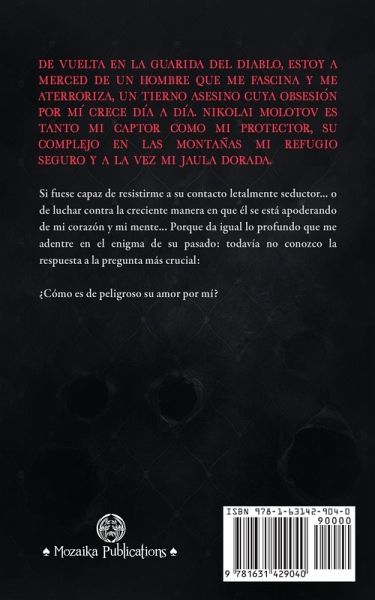 De vuelta en la guarida del diablo, estoy a merced de un hombre que me fascina y me aterroriza, un tierno asesino cuya obsesión por mí crece día a día. Nikolai Molotov es tanto mi captor como mi protector, su complejo en las montañas mi refugio seguro y a la vez mi jaula dorada. Si fuese capaz de resistirme a su contacto letalmente seductor... o de luchar contra la creciente manera en que él se está apoderando de mi corazón y mi mente... Porque da igual lo profundo que me adentre en el enigma de su pasado: todavía no conozco la respuesta a la pregunta más crucial: ¿Cómo es de peligroso su amor por mí? Nota: Esta es la conclusión de la historia de Nikolai y Chloe.