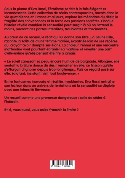 Sous la plume d'Eva Rossi, l'érotisme se fait à la fois élégant et incandescent. Cette collection de récits contemporains, ancrés dans la vie quotidienne en France et ailleurs, explore les méandres du désir, la fragilité des convenances et la force des passions secrètes. Chaque histoire révèle combien la sensualité peut surgir là où on l'attend le moins, ouvrant des portes interdites, troublantes et fascinantes.Au coeur de ce recueil, le récit qui lui donne son titre, La Jeune Fille, raconte la solitude d'une femme mariée, expatriée loin de ses repères, qui croyait avoir dompté ses élans. La chaleur, l'ennui et une rencontre inattendue vont pourtant ébranler sa maîtrise et réveiller une part d'elle-même qu'elle pensait éteinte à jamais.« Le soleil caressait sa peau encore humide de baignade. Allongée, elle sentait la brûlure douce du désir remonter en elle, ce frisson qu'elle s'efforçait d'ignorer depuis trop longtemps... Puis ce regard posé sur elle, éclatant, insistant, vint tout bouleverser. »Entre fantasmes inavoués et réalités troublantes, Eva Rossi entraîne son lecteur dans un univers de tentations où la sensualité se déploie avec une intensité fiévreuse.Un recueil comme une promesse dangereuse : celle de céder à l'interdit.Et si, vous aussi, vous osiez franchir la limite ?