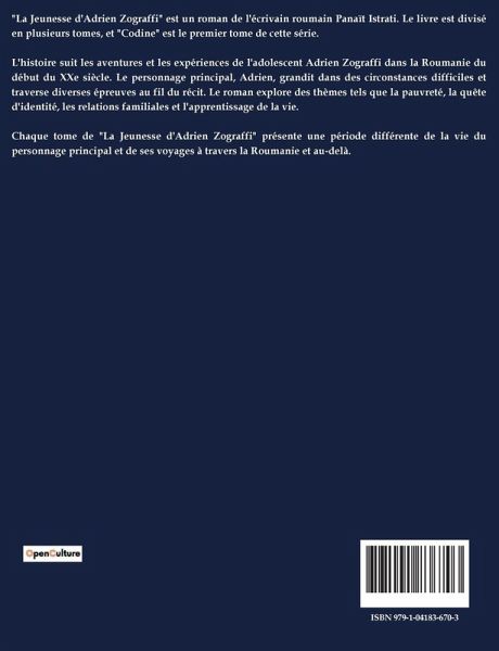 "La Jeunesse d'Adrien Zograffi" est un roman de l'écrivain roumain Panaït Istrati. Le livre est divisé en plusieurs tomes, et "Codine" est le premier tome de cette série. L'histoire suit les aventures et les expériences de l'adolescent Adrien Zograffi dans la Roumanie du début du XXe siècle. Le personnage principal, Adrien, grandit dans des circonstances difficiles et traverse diverses épreuves au fil du récit. Le roman explore des thèmes tels que la pauvreté, la quête d'identité, les relations familiales et l'apprentissage de la vie. Chaque tome de "La Jeunesse d'Adrien Zograffi" présente une période différente de la vie du personnage principal et de ses voyages à travers la Roumanie et au-delà.
